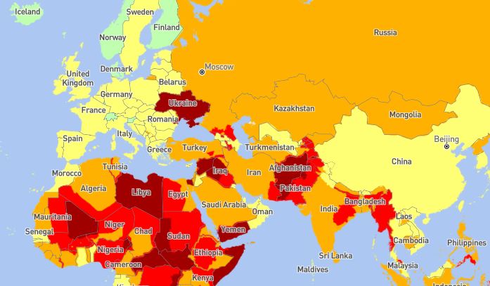 Pakistan – in particular Baluchistan is a region that is currently extremely high risk for travellers primarily due to kidnapping. Secondly, the border between Bangladesh and Myanmar is closed. Hiking the southern route would mean that I have to take a flight at least two times. The map below shows how dangerous travel is currently seen in different countries.