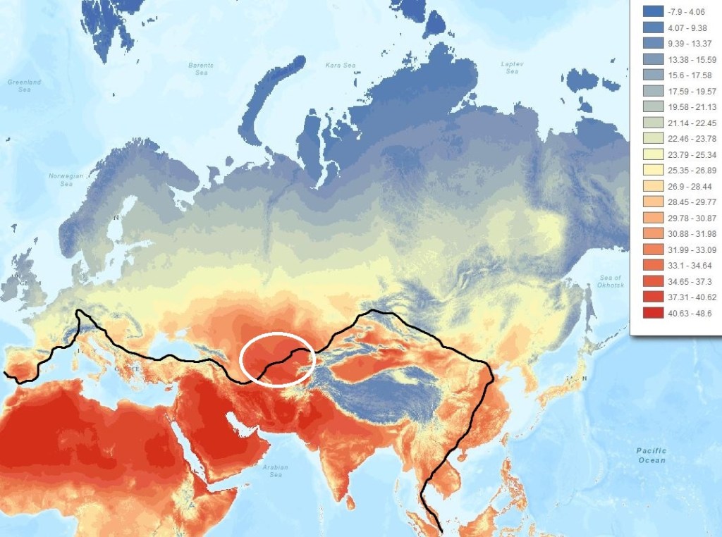 Therfore the Southern route (via India) should be walked only in Winter and the Northern route (via Central Asia and Mongolia) only in Summer. In contrast to Asia, the relatively low anual temperature amplitude in Central Europe allows hiking any time of the year.