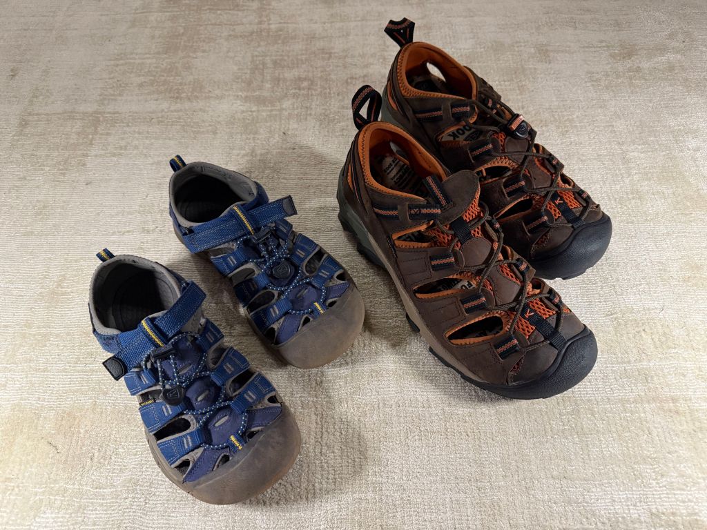 We wear Keen Arroyo II sandals, which are wide at the front, providing ample toe movement and breathability. Though they get wet in the rain, they dry quickly. Anyway, wearing water-proof socks, our feet will stay dry. These sandals have kept us blister-free so far.