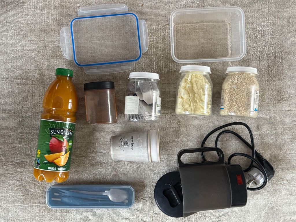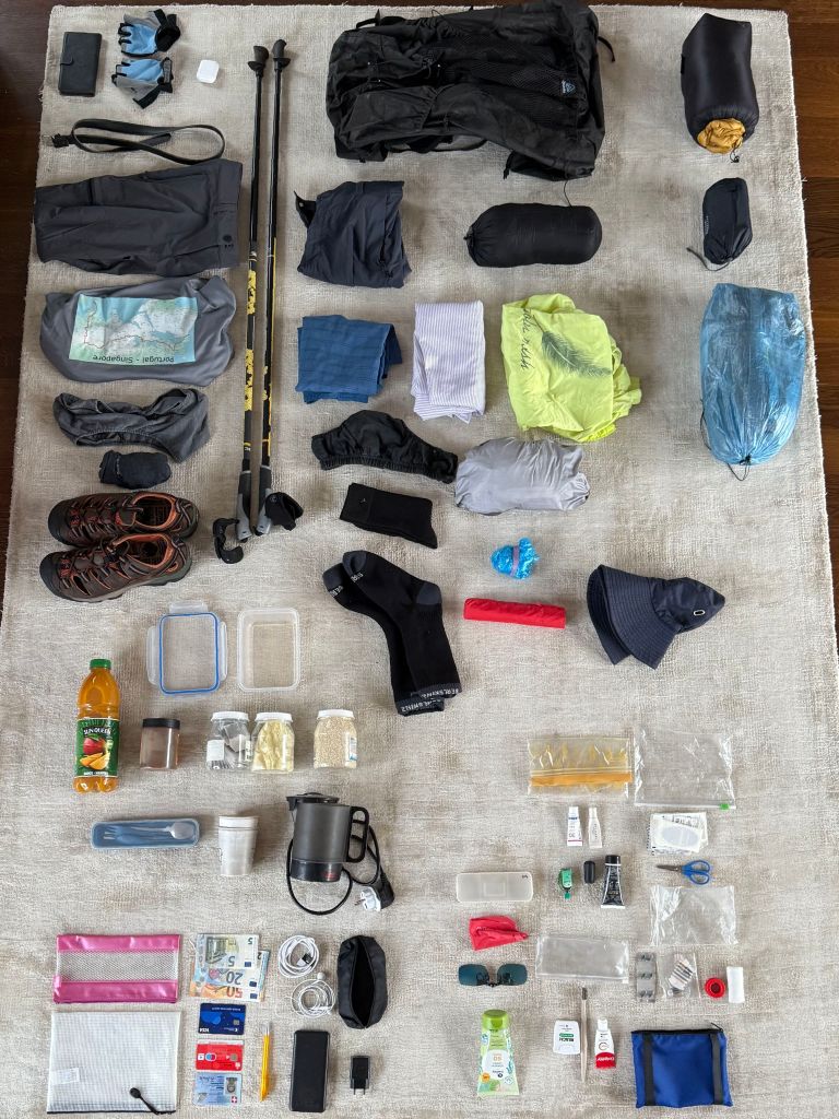 On top of the base weight I carry 1 liter of water and 500g of nuts or similar dry food a day’s stage. While an electric kettle (420g) might seem superfluous, it allows us to enjoy warm drinks regardless of opening hours – from morning coffee to evening tea. Guang can enjoy hot noodles in the morning. Of course, the kettle is not so helpful for the rare camping nights in the wilderness. When Guang joins me, I’ll also carry some of her luggage.