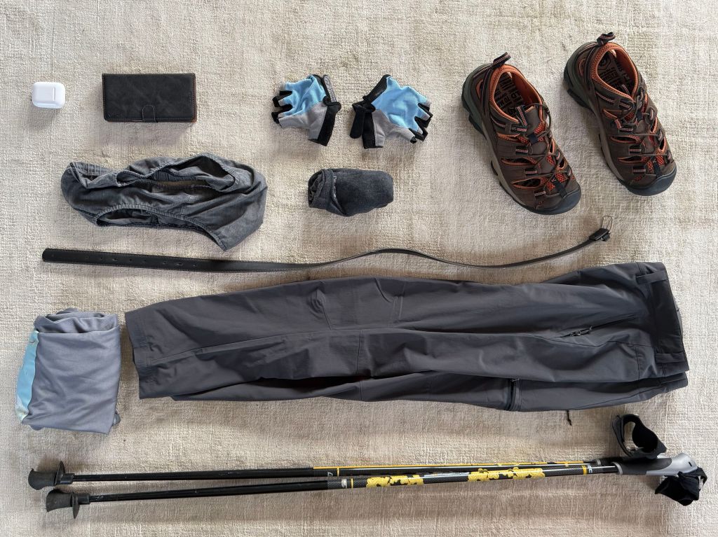 In addition, I carry on my body: clothes (800g), shoes (700g) and hiking poles (400g) as well as my mobile phone & headphones (300g).