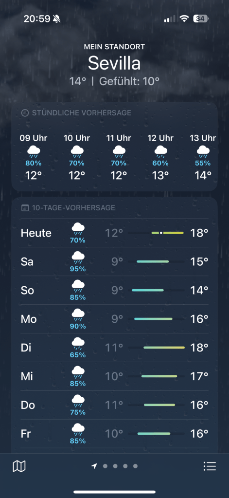 The past week can best be summarized with the two words “mud” and “water.” Spain is not well-prepared for heavy rainfall. As soon as we leave the road, we get stuck in the mud. Guang often chose the road proactively, while I, overly optimistic, kept trying to take the field paths. There is simply no concept for pedestrians traveling between towns. And when the heavy rain comes, it becomes practically impossible to get through. Even after a day or two of sunshine, the paths remain impassable. The weather forecast predicts rain for the next ten days, but its unreliability has been so great that we’ve lost faith in it.