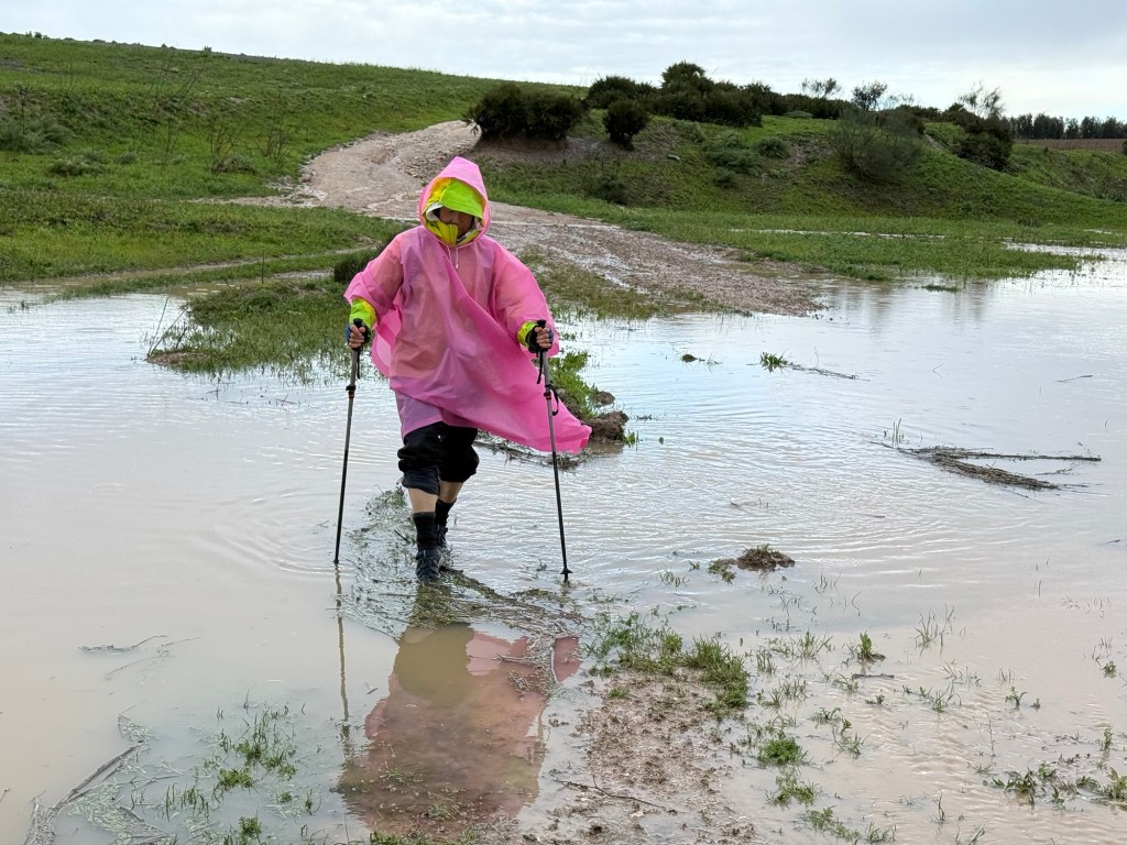 We followed a path far from the roads when suddenly, a river with no bridge appeared before us. I tried to cross it alone first, but halfway through, the water was chest-deep, and the current was too strong—it nearly swept me away! After two attempts (with and without my backpack), we gave up. However, crossing the river was practically our only option. Taking a detour via the road would have added 15 km, making it impossible to reach our daily goal. So, I devised a route over a nearby railway embankment, which required trudging through waterlogged, sticky mudfields and wading through deep water. Two hours and 8 kilometers later, we finally reached the other side of the “impassable” river. We had made it!