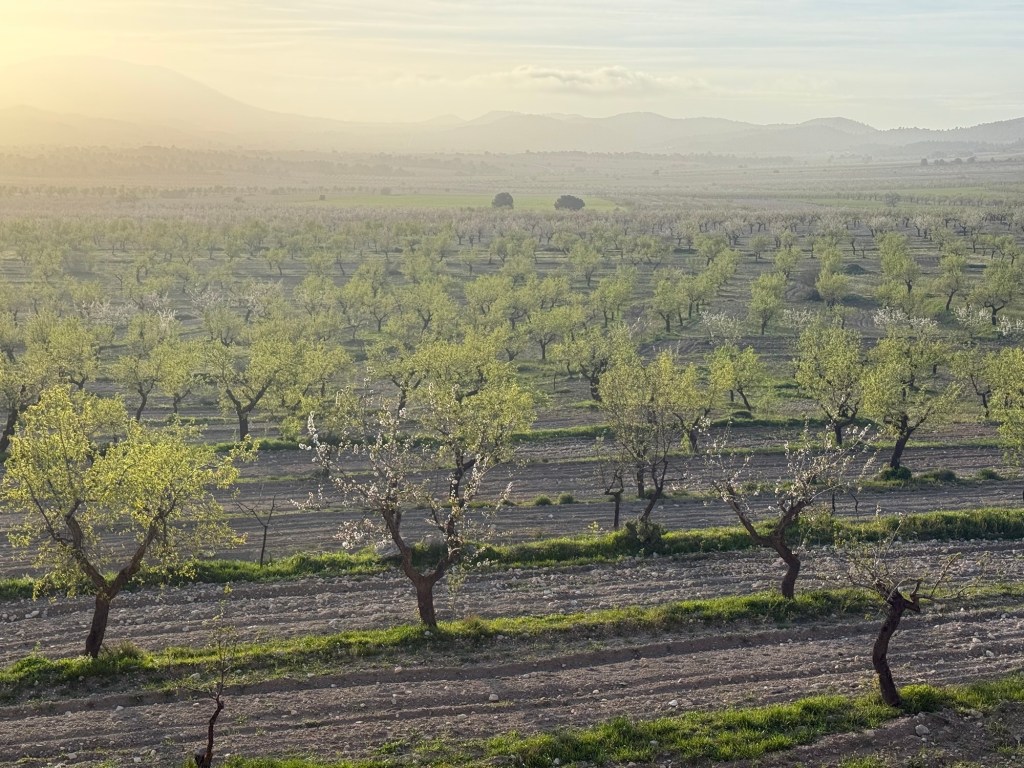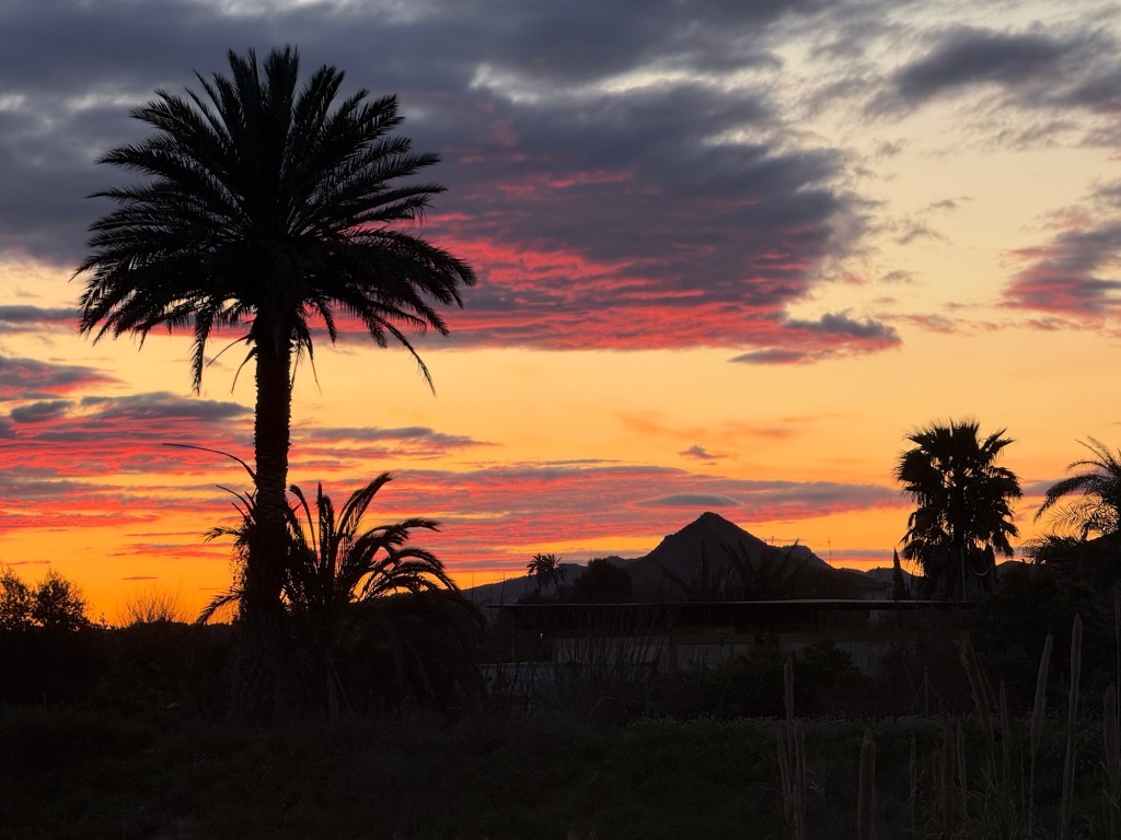 In Murcia, I rose at 4:00 AM and left my apartment by 5:20 after a hearty breakfast (my wife despises my dawn-loving trait, shared by only 10% of humanity). Alone, I wandered the empty, pre-dawn streets, savoring the sweet scent of orange blossoms. As I left the city, a delicate dawn glow emerged, culminating in a breathtaking sunrise over conical hills. I followed the Río Segura’s winding banks, later passing through historic Orihuela and Callosa de Segura—their monasteries and churches blending architectural eras. Yet after countless sacred sites, saturation sets in; déjà vu haunts me.