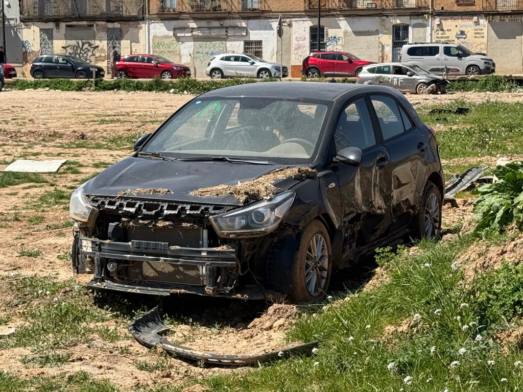 Today, I passed Catarroja and Massanassa, ravaged by floods in October 2024. Five months later, mud still plagues these towns south of Valencia. Half the shops remain closed; repairs drag on, wrecked cars linger, and debris clutters trees. Locals showed me how floodwaters rose over 2 meters here.