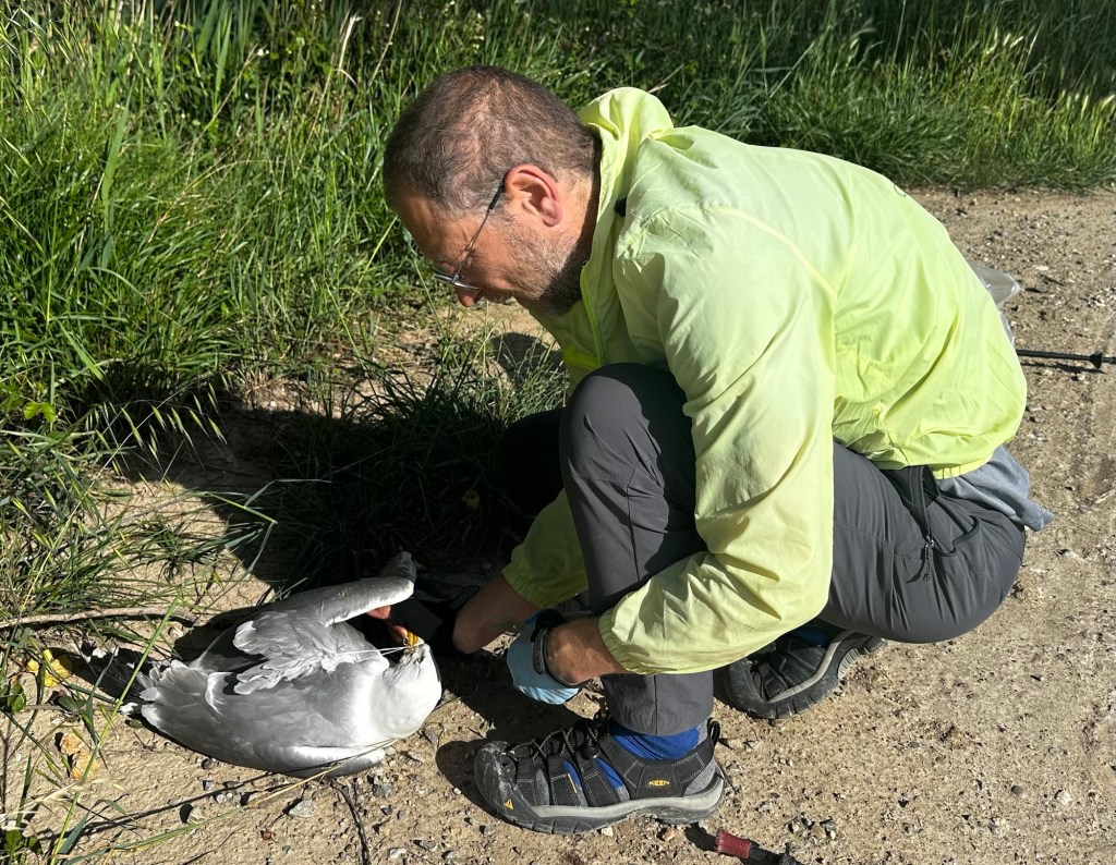 Between Perpignan and Narbonne, we walked a very special path through a nature park along a canal that separates two lagoons. To our left and right, the sea stretched out while we walked on a narrow footbridge. Suddenly, a seagull appeared in front of us, behaving strangely. It could no longer fly or eat because a string was wrapped around its wings and beak. I tried to grab the seagull, but it bit my fingers. I hadn’t realized seagulls had such strength. Eventually, I managed to clamp its beak shut. Then we used scissors to free its wings and finally its beak from the string. Now the seagull stayed completely still, probably realizing we only wanted to help. When we released it, it immediately plunged into a puddle and began to drink. Apparently, it hadn’t been able to drink with its beak tied shut.