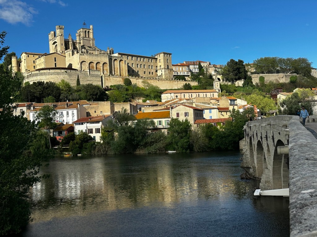 Das will ich an einem Beispiel erklären: Eigentlich waren es von Narbonne nach Béziers, gerechnet an der kürzestem Strecke nur 26 km, nämlich entlang der Hauptstrasse. Am Morgen steckte ich eine Route entlang verkehrsfreien Feldwegen oder kleinen Nebenstrassen auf meiner Landkarte ab. Inzwischen sind wir umgestiegen von Maps.me auf Mapy.com, wegen dessen Übersichtlichkeit und Stabilität. Gemäss meiner abgesteckten Route wären es 31 km gewesen. In der Wirklichkeit aber machten noch weitere Umwege (d.h. 33km) und vor allem liefen wir in Béziers noch eine Stadtbesichtigungrunde, sodass es insgesamt 36 km wurden, also 40% mehr als die kürzeste Verbindung. Das ist aber oft so und erklärt auch den Unterschied zwischen unseren vielen Kilometern im Gegensatz zu den angegebenen Kilometern bei Google Maps. Bei der Tagesplanung muss ich stets 40 % Zusatzkilometer hinzurechnen.