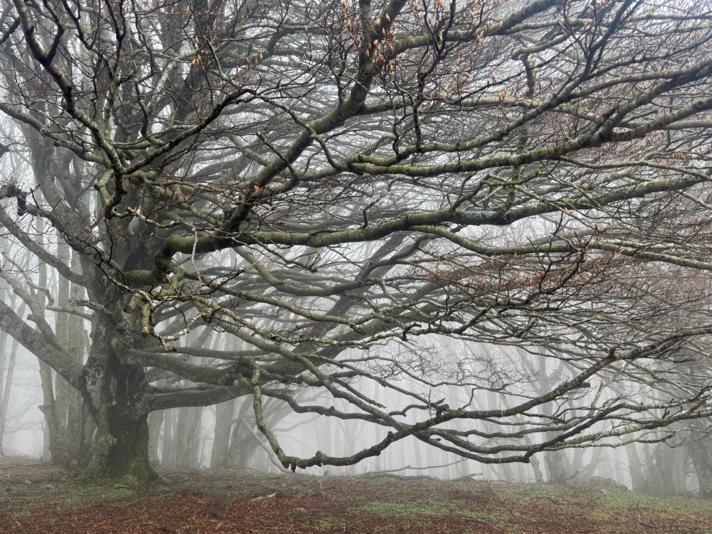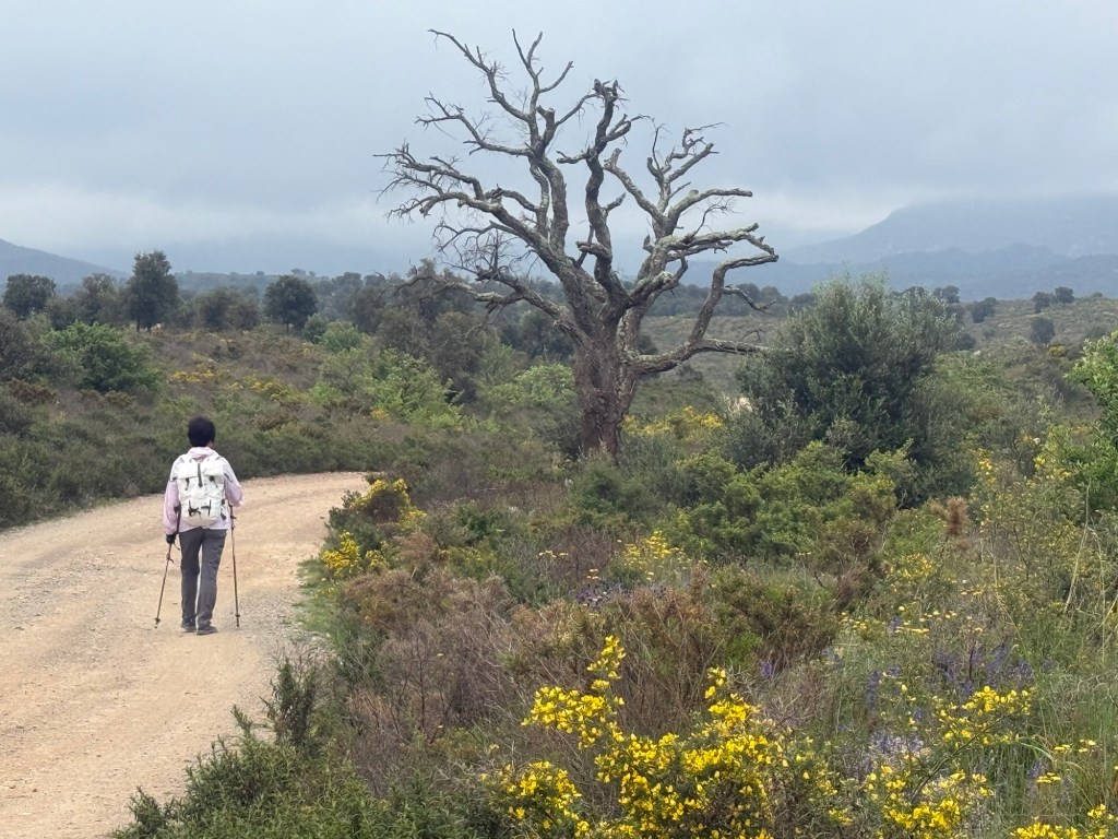 Already suspecting that this day would be a hard hike, we started early from Figueres. The first 15 kilometers were covered quickly in the flatlands. But then a barely visible path led through the cork oak forest. At some point, we completely lost the trail. Although our map showed a path, reality did not. So we wandered aimlessly through the thicket up the steep mountain. Occasionally, we thought we spotted a path, but it turned out to be wild boar trails. The closer we got to the ridge, the steeper the terrain became. At the top, it became stormy and rainy. We got so cold that we put on all the clothing we had with us. Visibility was sometimes only a few meters, even though we should have had a clear view to the sea in theory. For a while, we struggled along the ridge path at 1,100 meters. The ridge is also the watershed and the national border between Spain and France. Then came the 1,000-meter descent on a difficult, slippery mountain path. Guang fell once, fortunately without serious injury. There were no settlements along the way, and we only met one other hiker.