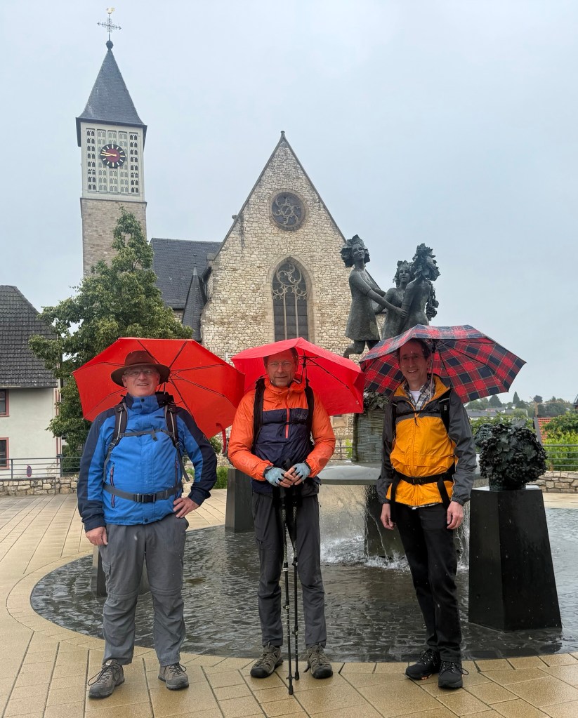 The final two days to Wiesbaden were with Volker, a friend since my civil service days at Wiesbaden’s youth hostel. Despite sporadic rain, my schoolmate Jörn joined on the last leg as well, and both kept their promise to accompany me home. I showed them my patented trick: clipping an umbrella under the backpack’s chest strap to keep hands free. Armed this way, we marched on paved bike paths across Rheinhessen’s open fields down to Mainz. On Wednesday evening, May 28, 2025, we arrived in the ‘world’s most beautiful city’—Wiesbaden (photos prove it!). Right in time for dinner at my father’s, where Nina and Angela who take care of my father, had prepared a feast. We celebrated with piano and songs—a perfect welcome.