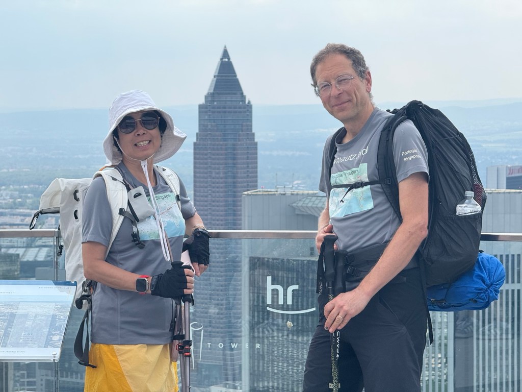 Kurz vor Frankfurt wurden wir überrascht: da stand plötzlich mein Freund Volker am Wegesrand! Er hatte mich schon zwei Tage durch Rheinland-Pfalz begleitet. Er arbeitet in Frankfurt und hatte mich gefunden, weil ich meine Location auf Google Maps freigegeben hatte. Wir liefen gemeinsam in die Frankfurter City und er führte uns auf den Main Tower, wo wir von einer offenen Besucherplattform in 200 m Höhe die Stadt bewundern konnten. Es ist die höchste Aussicht, die man in Frankfurt als Tourist legal haben kann.