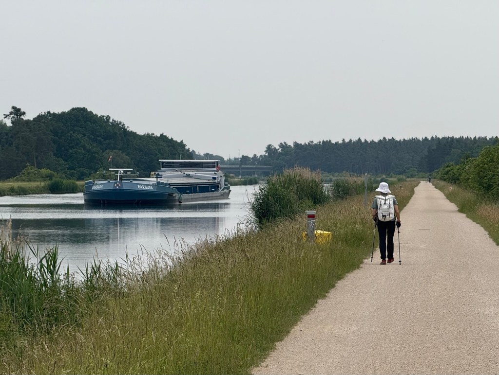 Nachdem wir den den Grossraum Erlangen-Nürnberg durchwandert hatten, liefen wir lange entlang des Main-Donaukanals. Der Kanal ist noch nicht alt: er wurde erst 1992 nach 32-jähriger Bauzeit eröffnet. Er ist 171 km lang, 43 m breit und 4.25 m tief. Die Binnenschifffahrt ist allerdings rückläufig, zumindest was der Transport von Gütern betrifft. Allerdings bekommt der Kanal Aufwind von den vielen Kreuzfahrtschiffen. Wir sahen 5 dieser sehr langen, aber schmalen Passagierschiffe mit ihren Kabinen auf zwei Decks. Die Fahrgäste haben fast ausnahmslos graue Haare. Einige von ihren winken uns zu. Da muss man Zeit und Geduld mitbringen: die Schiffe sind kaum schneller als wir. Und bei den Schleusen können wir sie beim Wandern sogar überholen. Wir passierten drei Schleusen mit je 25 m Fallhöhe, das ist ein Rekord, zumindest innerhalb Deutschlands. Und dann überschritten wir auch die Scheitelhöhe von 406 m über NHN, was auch einen Rekord innerhalb Deutschlands darstellt. Zugleich haben wir damit auch die Wasserscheide zwischen der Nordsee und dem Schwarzen Meer überschritten.
