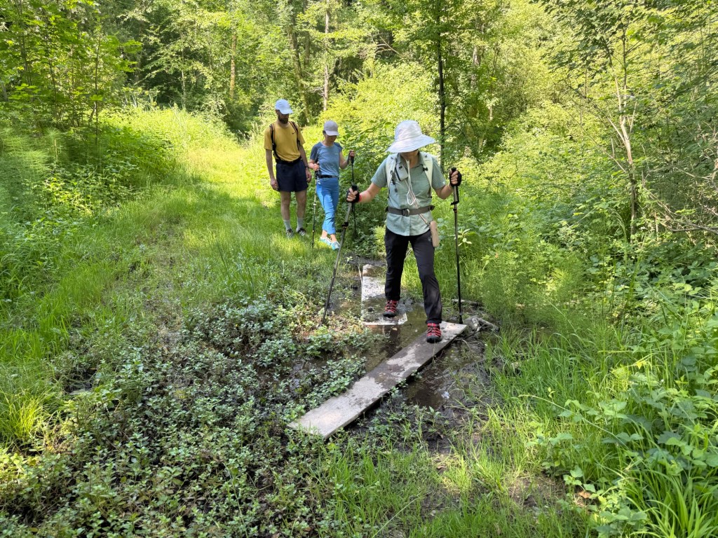 Dennoch war es oft schon ab 10 Uhr beim wandern schwül-heiss, in der Sonne fast unerträglich zu laufen. Daher nutzte ich jede Gelegenheit, mir Wasser über den Kopf und den Körper zu schütten. Das ist viel weniger anstrengend, als den Körper mit eigenem Schweiss zu kühlen. Oft ging ich mit gesamter Kleidung in einen Bach. Das hat gleich drei Vorteile: