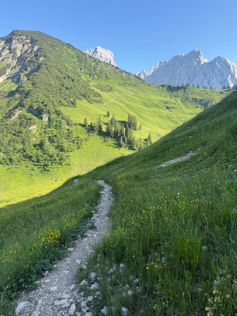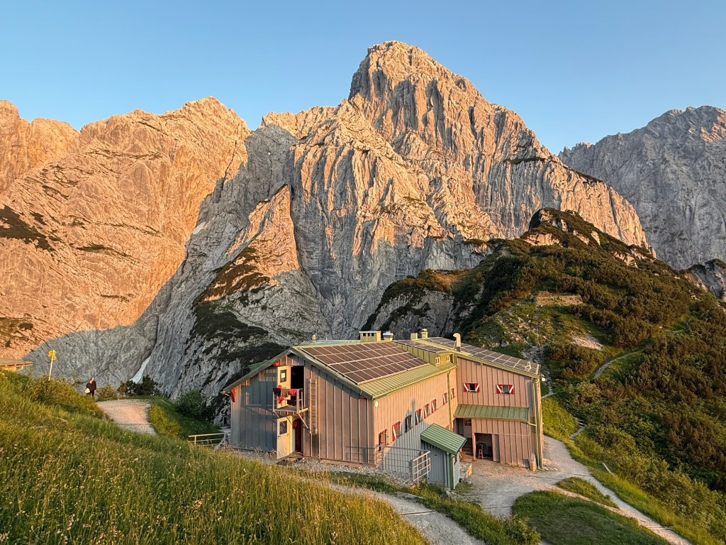 Back in Germany, just before the Austrian border, Guang and I parted ways. She took the train from Raubling back to our home in Zurich and won’t rejoin me until late July. Saying goodbye was as hard as ever, and I felt deeply sad while hiking along the Inn River. But once I reached the mountains, the challenging terrain demanded full focus, distracting me from my thoughts. Ahead lay the trail to Ellmauer Tor, marked with a black circle. “How hard could it be?” I thought—after all, it was labeled red-white-red. Only later did I learn that such paths in Austria can reach difficulty level T5. Sure enough, I found myself clinging to vertical rock faces, gripping steel cables for dear life. The trick was never to look down. It took me all morning to reach the top, and I didn’t meet a single hiker along the way. I even filmed a funny clip in a patch of snow—check it out!