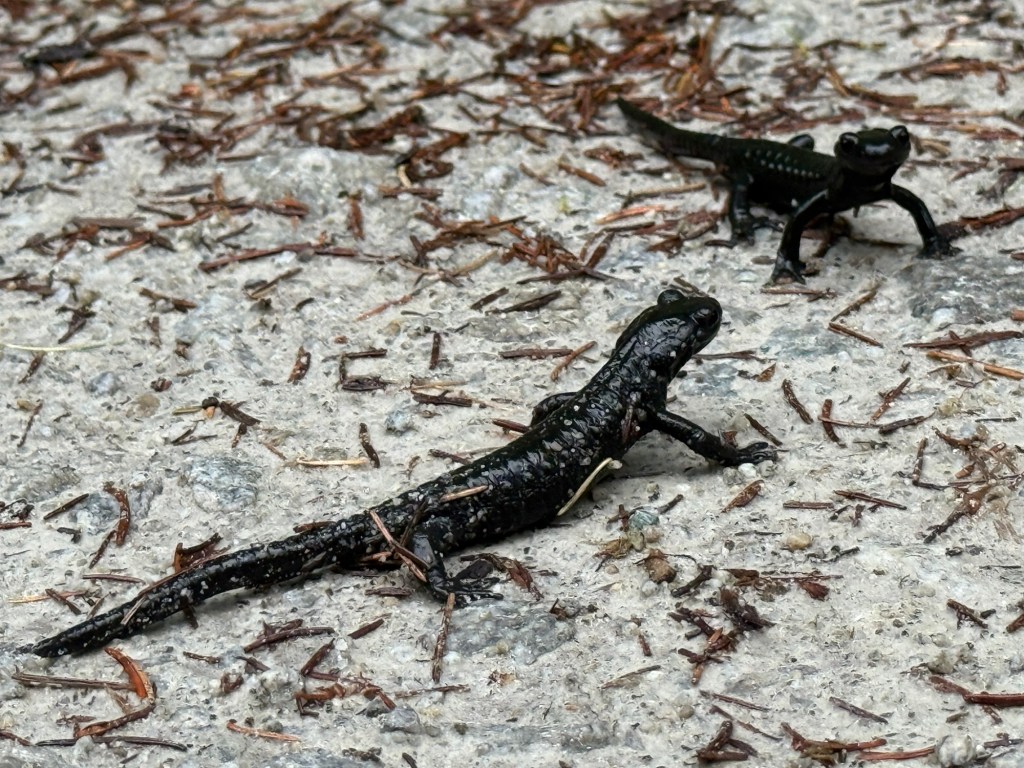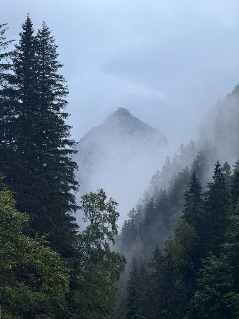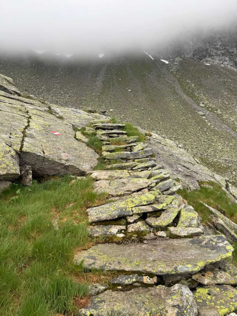 For the Alpine crossing, I chose the 2,459-meter-high Korntauern Pass. After a night of thunderstorms, the trail was damp and foggy. The fir forest teemed with black salamanders—I must’ve seen nearly 1,000, carefully stepping around them. Some were even mid-brawl (watch the video!). The pass, once a Roman cart road, still had stretches of ancient paving. Higher up, it grew cold, windy, and misty—I was literally in the clouds. Thankfully, no snowfields remained to complicate the crossing. For six hours, I didn’t meet a soul until descending.