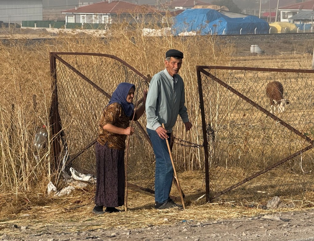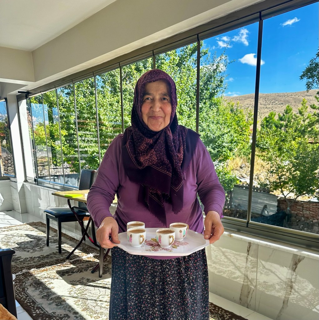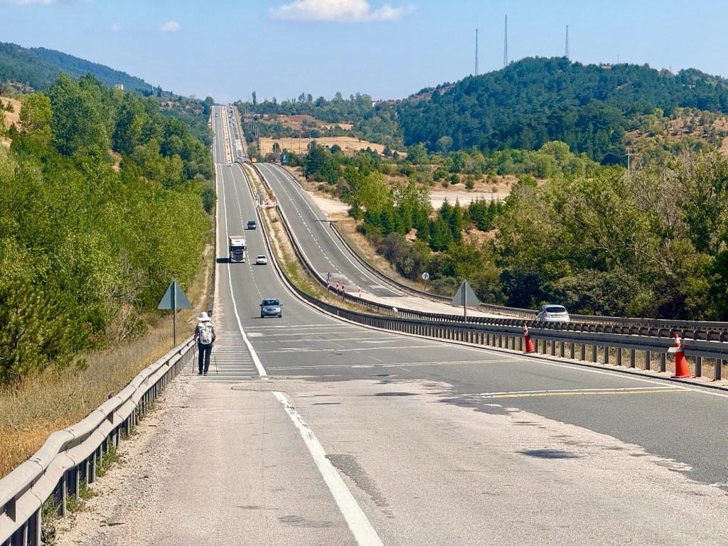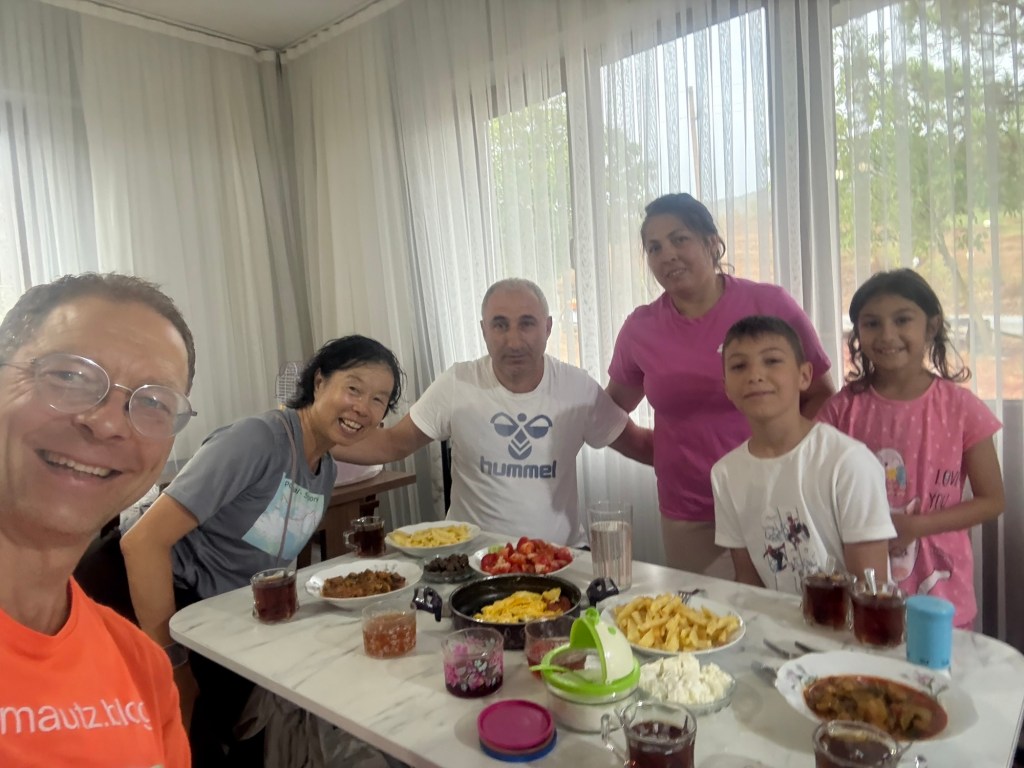 Four days past Istanbul, Guang joined me for two weeks to hike together. For me, it was, as always, a wonderful time because I have a fantastic partner in her, someone I can always communicate well with. Unfortunately, the route we had to cover together often ran alongside a four-lane highway. To avoid one major four-lane road, we once took a detour adding 5 km, which meant we were on small, mostly paved country roads except for the last 3 km. We passed through several small villages. In one of these villages, a man invited us for tea (Çay). We accepted the invitation and were astonished to see a fully set table in his living room. It turned out the man had previously overtaken us in his car and then, with his wife, prepared everything at home to invite us. It was perfect timing for us, as we were hungry and hadn’t brought any lunch. We discovered the family, like everyone else in this village, are Circassians originating from the Caucasian republic of Adygea. They were expelled by the Russians 150 years ago and settled in this area. The father showed us his traditional Caucasian hat and his skills playing the accordion. Throughout the day, my backpack kept getting heavier, as hardly a car passed without stopping to offer us drinks, hazelnuts, or fruit.