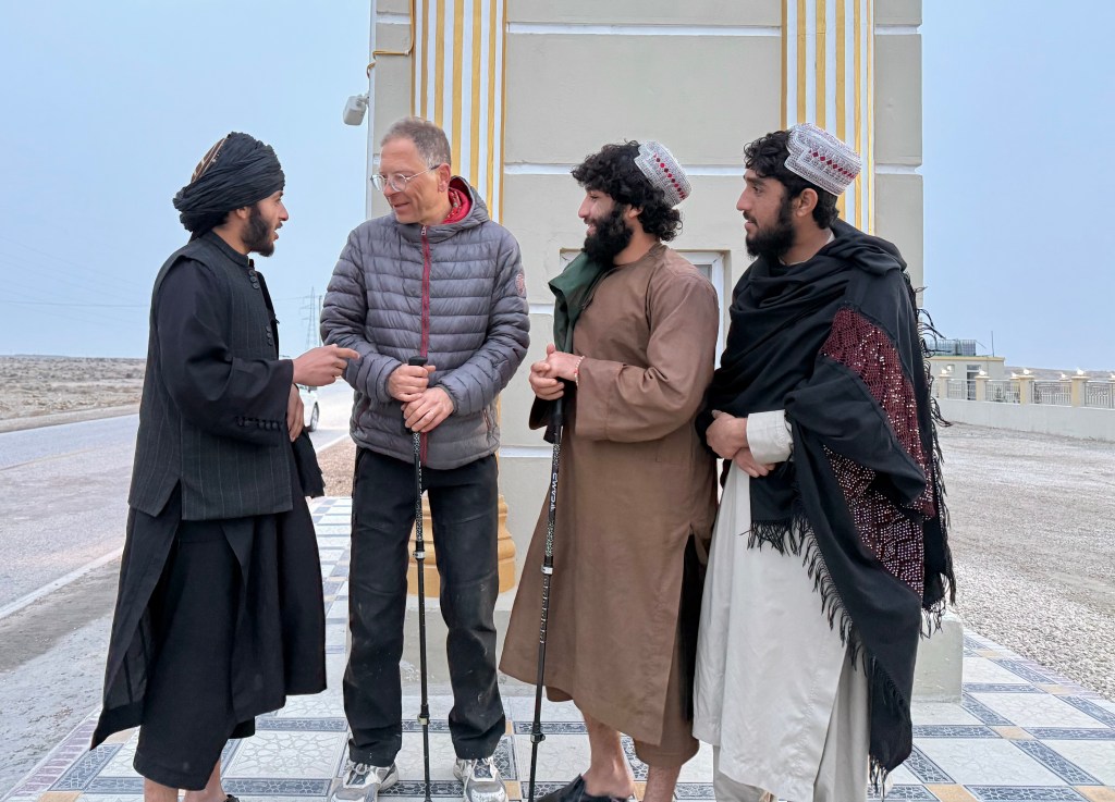Back to today: it was already midday when I arrived back at the Taliban checkpoint. The taxi let me out at the post, and I probably made the mistake of immediately starting to walk towards the city of Mazar-i-Sharif. I had barely gone 200 m when the Taliban called me back. Now I realized that I should have greeted the Taliban properly, because in Afghanistan it’s impossible to avoid them. And my attempt to bypass them didn’t go over well. Unfortunately, different personnel were at the post today who didn’t know me yet. Their leader took my passport and detained me. So I sat there for 2 hours with him on a bed set up by the road, while he enjoyed trimming his long beard. Communication was difficult, if not impossible. They were quite authoritative with me, but polite, and I was given tea. Since the post was in the middle of the desert, there was no internet, so I couldn’t call anyone for help. But then I remembered that I had the phone number of our English-speaking friend Mohammed and was able to establish communication. Through him, I learned that they were detaining me because, for security reasons, they didn’t want to let me walk alone. But then the top chief arrived with a group of colleagues. He spoke good English, so I could explain my mode of travel to him. My T-shirt with the route also helped explain my intention. He said that I shouldn’t expect problems at any Taliban checkpoints, police checkpoints, or Mujahideen checkpoints. However, he couldn’t guarantee my safety if I walked away from the road. And also not if someone harmed me between the posts. So, I was finally allowed to continue on foot. Before that, I had the chief record a video in which he states this permission in Persian, so I could show it at checkpoints.