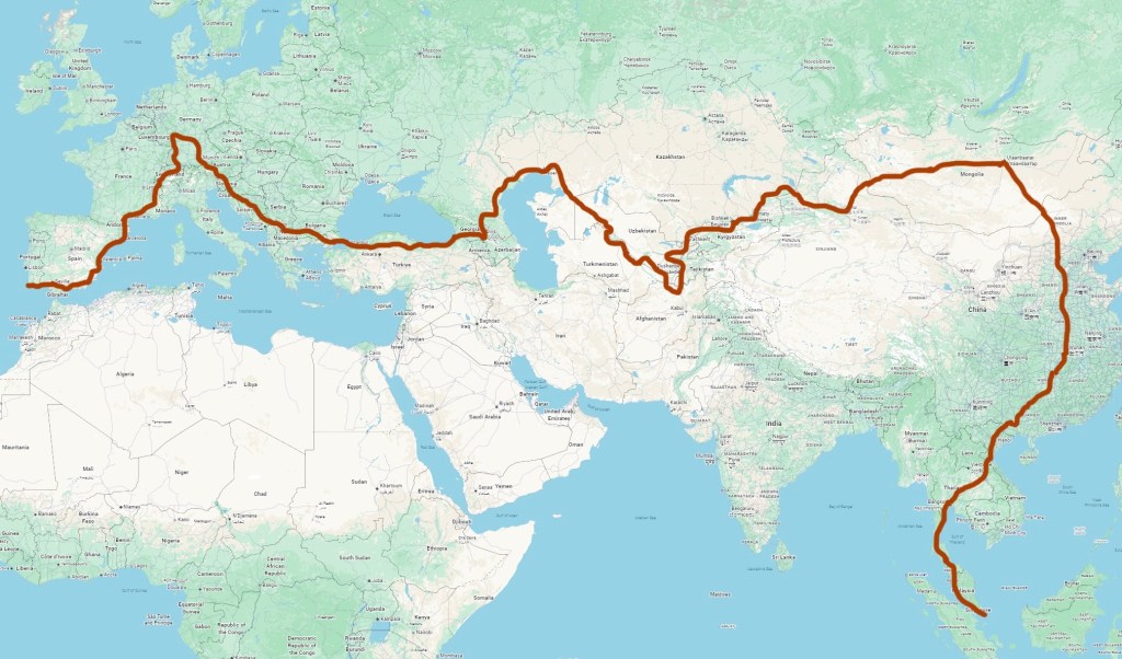 Lisbon – Singapore That would be the longest route on the Euro-Asian continent: A more realistic route would avoid Ukraine and Afghanistan. But there are still issues on crossing Pakistan and Myanmar: Read More